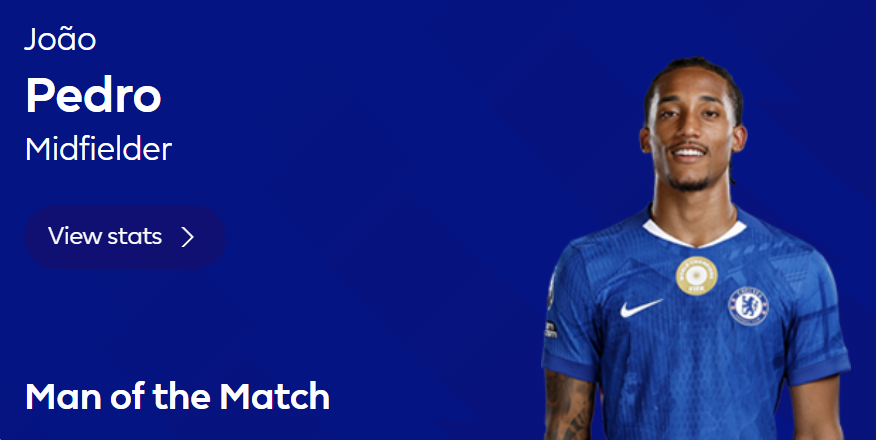 蓝军前锋佩德罗首发出战并打满全场,帮助球队首开记录,他也在赛后被官方评选为本场比赛最佳球员。