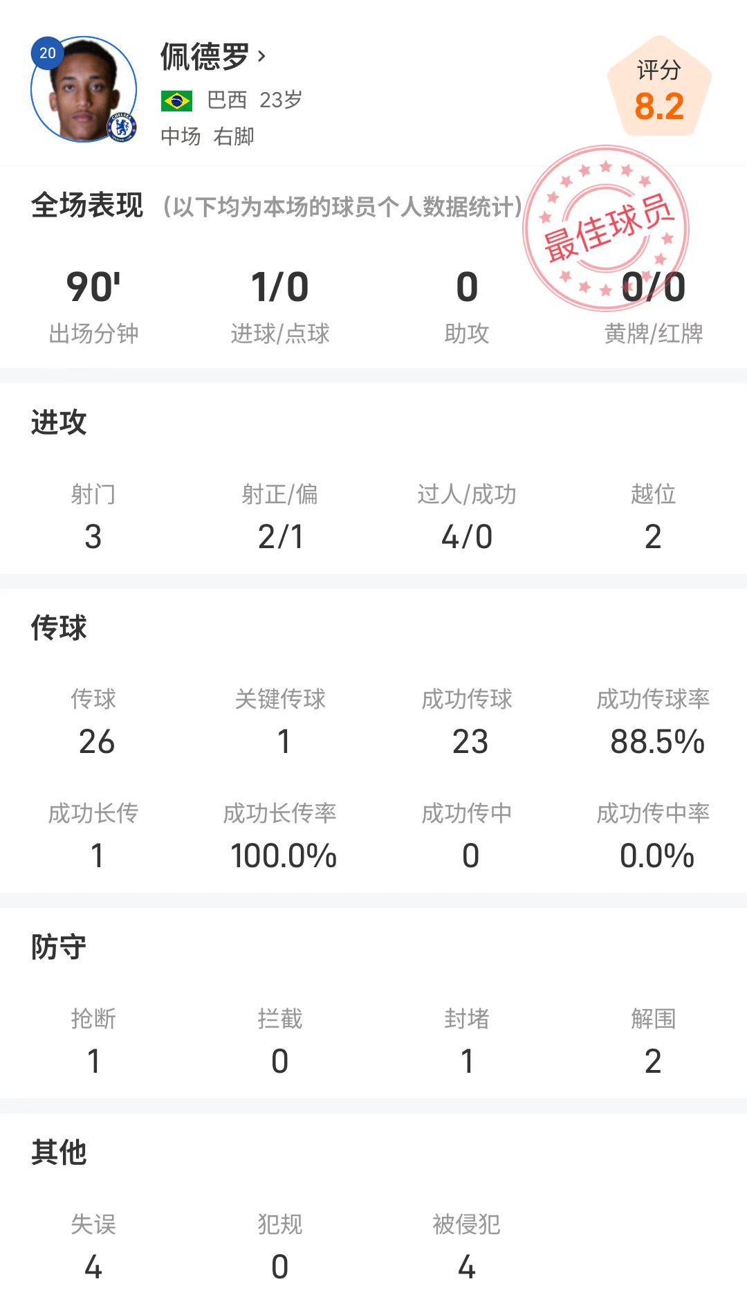 佩德罗本场比赛3次射门,2次射正并打进一球,送出一次关键传球,传球成功率达88.5%。