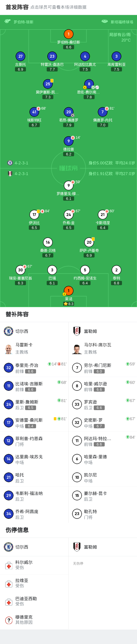 第67分钟,双方换人,切尔西吉滕斯,富勒姆罗宾逊、史密斯-罗登场